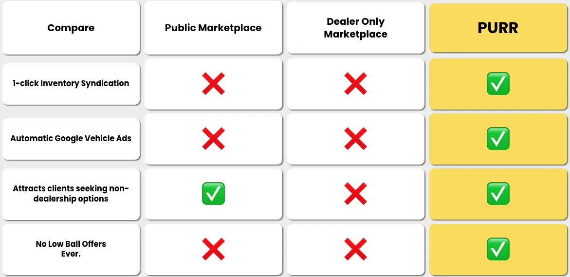 PURR is 100% free for the next 15 dealers to sign on. This means we pay for all your advertising and you just get your cars sold for free!